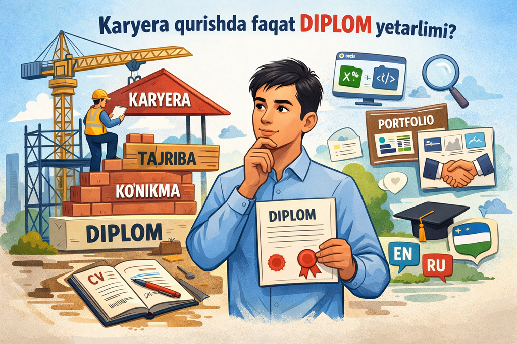 Yurtimizda bir fikr chuqur ildiz otgan:“Diplom bo‘lsa, ish bo‘ladi.” Ota-onalar shuni xohlaydi.Maktab shuni singdiradi.Jamiyat shunga ishonadi. Lekin 2026-yilga kelib bitta haqiqat bor:Diplom — zarur. Lekin yetarli emas. 1. Diplom nimani beradi, nimani bermaydi? Diplom nimani beradi: Boshlang‘ich ruxsat (ish bozoriga kirish chiptasi) Davlat tashkilotlarida formal talabni yopadi Nazariy asos va umumiy savodxonlik beradi Diplom nimani…
