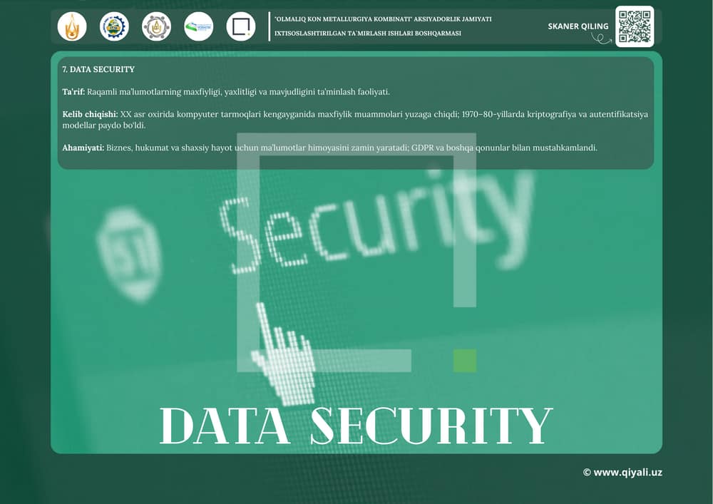 Data Security – bu texnik vositalar jamlanmasi emas, balki butun boshqaruv va madaniyat tizimi. Har bir tashkilot – xoh kichik kompaniya bo‘lsin, xoh yirik korxona – o‘z ma’lumotlarini qanday himoyalayotgani orqali o‘zining barqarorligi va kelajagini belgilaydi.