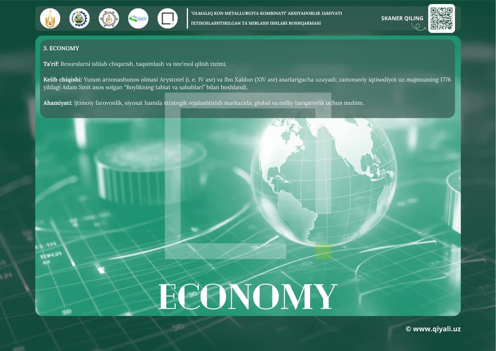 Iqtisodiyot — bu insonlar cheklangan resurslar sharoitida qanday tanlov qilishi, ishlab chiqarishi, taqsimlashi va iste’mol qilishi haqida fan. Ammo u faqat raqamlar, grafiklar yoki bozorlar emas. Economy — bu jamiyat qanday nafas oladi, yashaydi va o‘sadi. Bu har bir non bo‘lagi, yoqilg‘i narxi yoki ish o‘rinining tagida yotgan dinamik harakatdir.