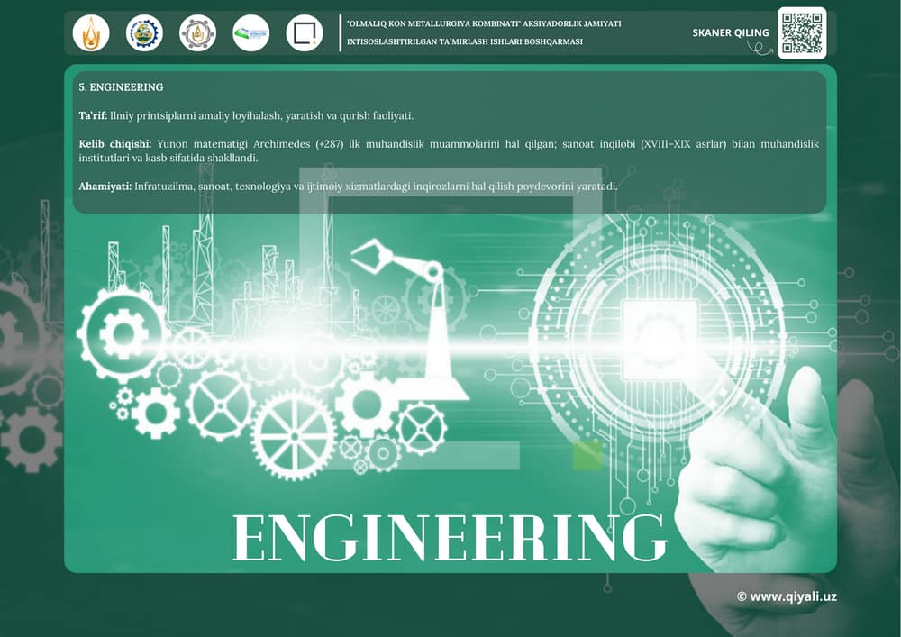 Bugungi global dunyoda muhandislik barcha sohalarda muhim rol o‘ynaydi. Quyidagi yo‘nalishlar asosiy muhandislik tarmoqlaridandir: