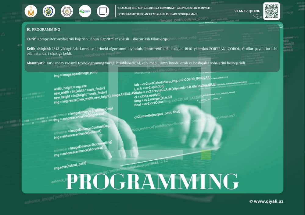 Zamon talabi shuki: kod yozmaydiganlar — uni tushunadiganlar bo‘lishi kerak. Chunki dasturlash – bu faqat texnologiya emas, bu fikrlash tarzi.